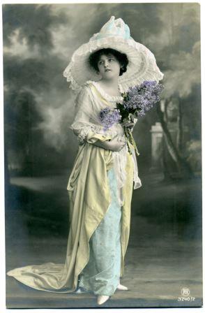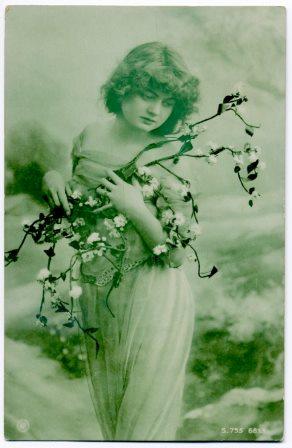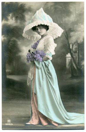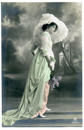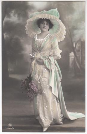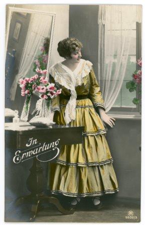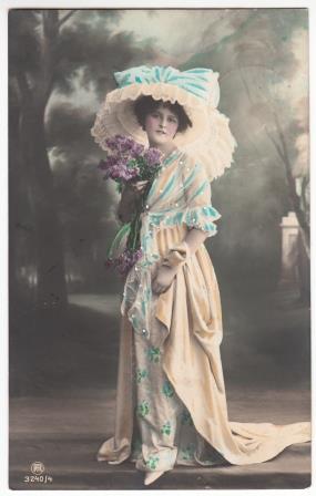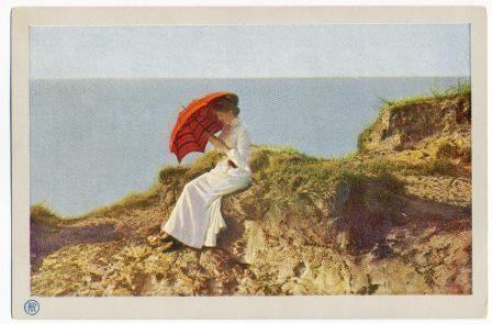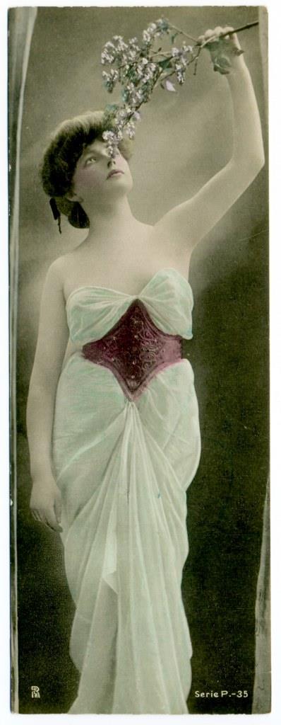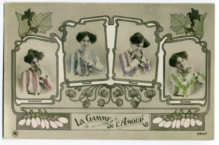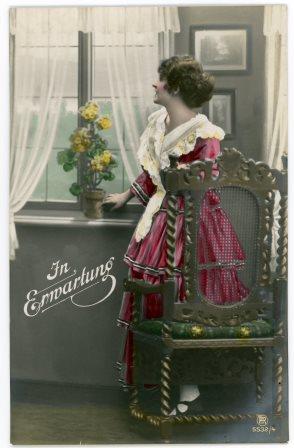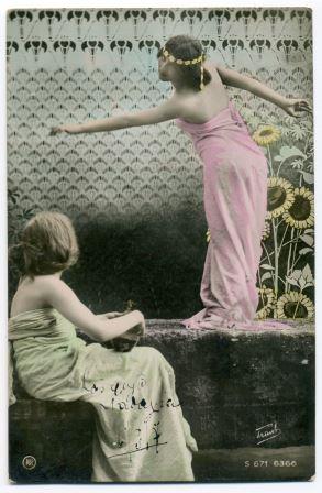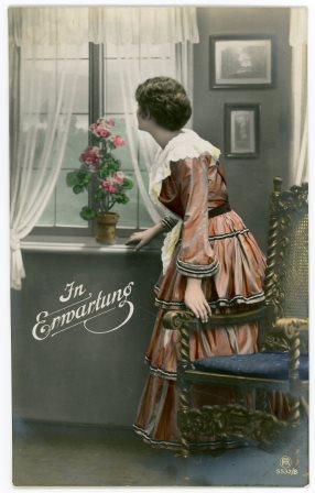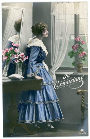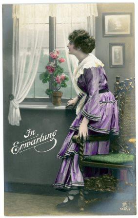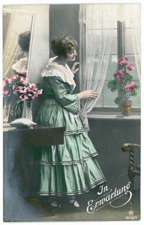 Whatever method used, the colors applied did not necessarily represent reality. Series 5532 is a particularly vivid illustration of the artistic license taken in the application of colors, with the model's dress changing color from card to card. Also changing color within the series are the flowers in the window and the pad on the chair seat.
