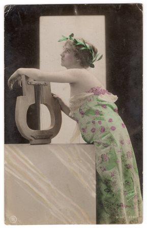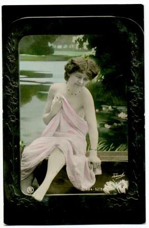 Evidence of the work of Ernst Schneider and his studio is found throughout the series. As early as series 622, the model, the pose, and the accessories all strongly suggest a photo from the 1907 Die Gestalt des Menschen und ihre Schönheit by Otto Schmidt and Ernst Schneider. At the other end of the number range, series 7237 is credited to Schneider on the card itself. Between the two, there are frequent signs of Schneider's work, including a few other series where the attribution appears on the card itself; several series where the name "Schneider" is scribbled into the photo's background; a number of series where the photographic card's image matches an art card signed by E. Schneider; and a number of series where the postcard's photo matches to a credited photo in a period magazine. Also suggesting Schneider's work is the connection of Wally (who appears on almost 300 RPH series) to Schneider in a Leslie-Judge portrait folio circa 1913: "She is now engaged by Ernst Schneider, the foremost German photographer, and poses every day for twenty or thirty photographs."