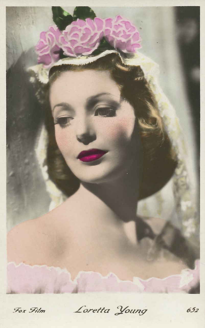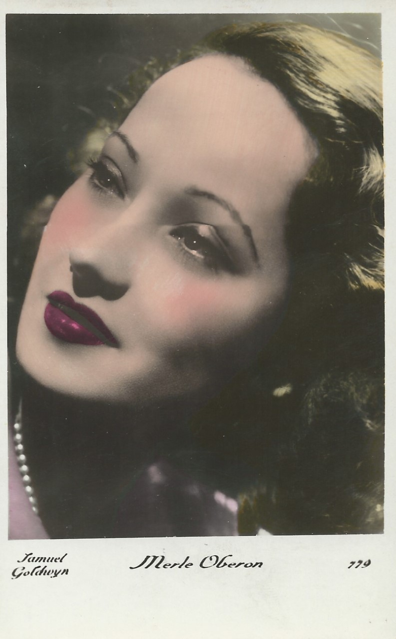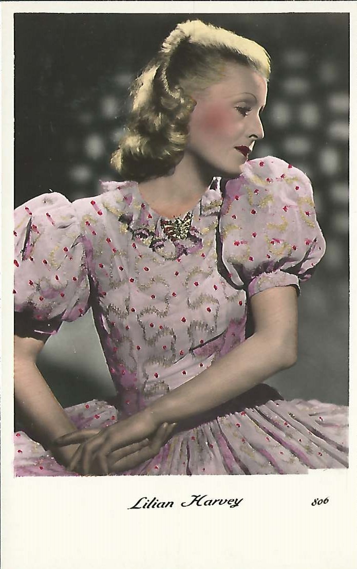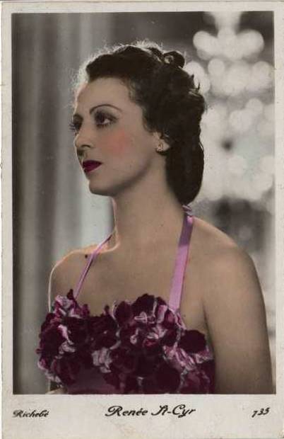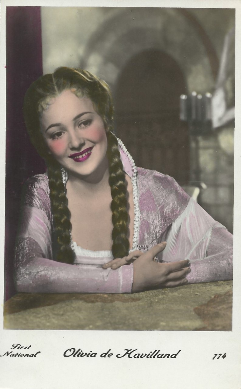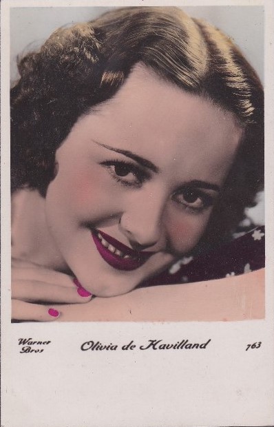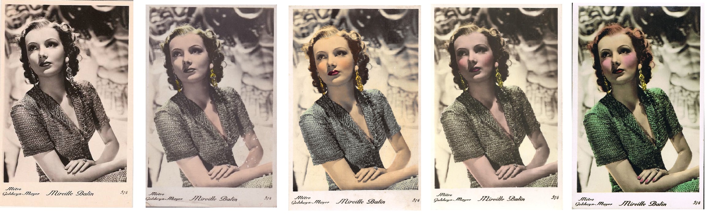 | Several 1938 and 1939 issues of Cinémonde magazine include a listing for three series of Erpé film star postcards. Series B cards are 9x14 cm and were produced in black-white glossy. Series B.C. cards are the same size but were tinted. Series I cards are chamois and larger in format at 15x10,5 cm. Series B and B.C. cards are numbered 501-888. In most cases cards for a given number depict the same image for both series. Therefore, the B and B.C. series cards are presented, intermingled, in a single catalog section below. Series I cards are numbered 1-225. The cards depict primarily French and American film stars. They are dated circa 1939, with Errol Flynn and Olivia de Havilland dressed in costumes from the 1938 film, 'Robin Hood' (cards 764 and 774), and Norma Shearer and Tyrone Power dressed in 'Marie Antoinette' costumes (cards 654 and 799), another 1938 production. Colors applied to the B.C. Series did not necessarily represent reality. Cards numbered 574 (below) demonstrate this variation in tints, with the dress and face and skin-tone changing color from card to card. |