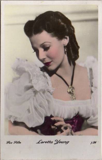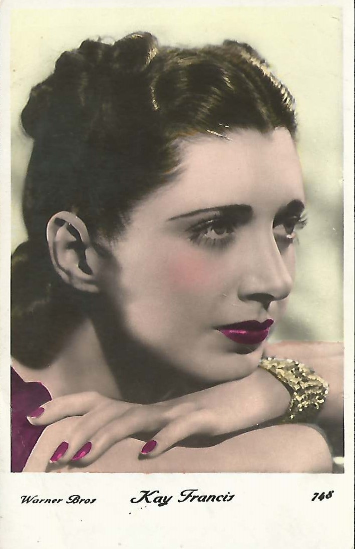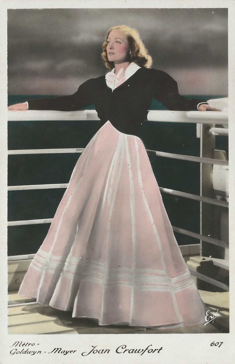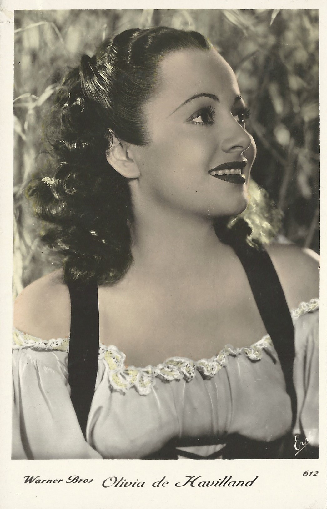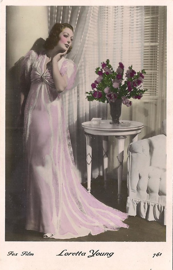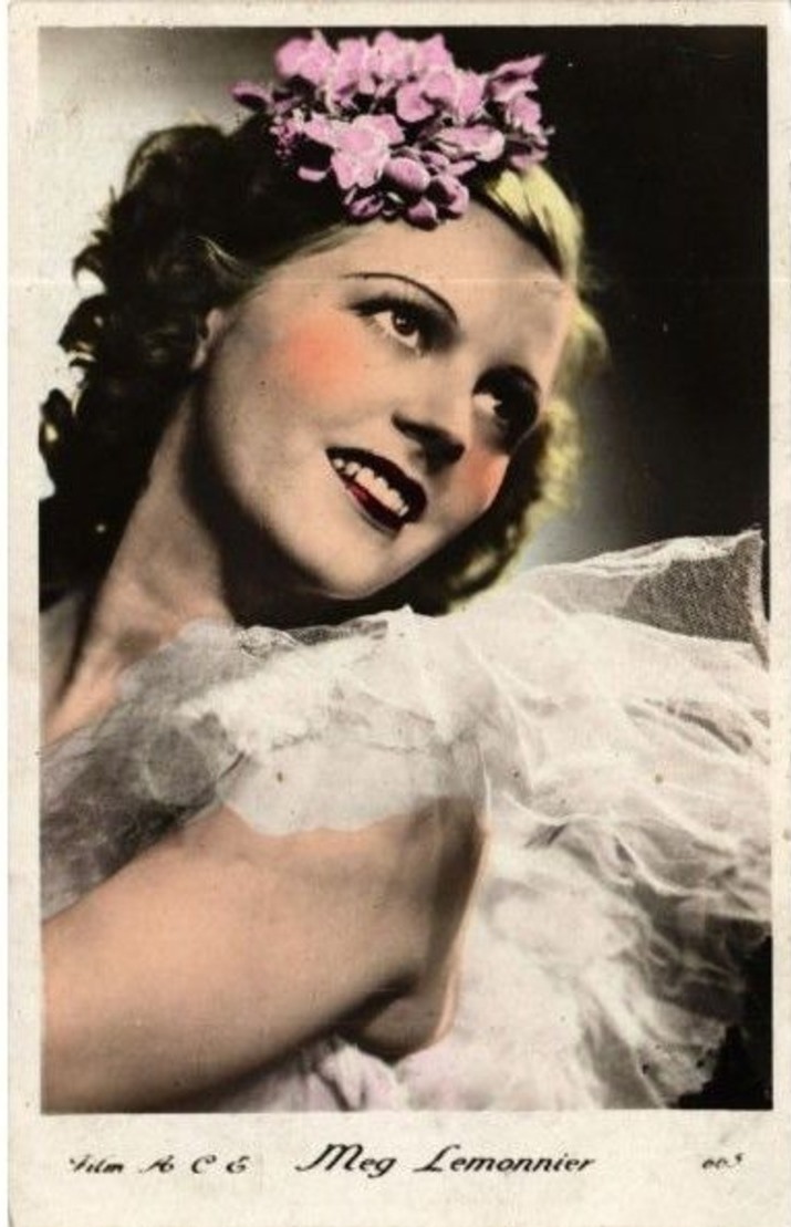 | Several 1938 and 1939 issues of Cinémonde magazine include a listing for three series of Erpé film star postcards. Series B cards are 9x14 cm and were produced in black-white glossy. Series B.C. cards are the same size but were tinted. Series I cards are chamois and larger in format at 15x10,5 cm. Series B and B.C. cards are numbered 501-888. In most cases cards for a given number depict the same image for both series. Therefore, the B and B.C. series cards are presented, intermingled, in a single catalog section below. Series I cards are numbered 1-225. The cards depict primarily French and American film stars. They are dated circa 1939, with Errol Flynn and Olivia de Havilland dressed in costumes from the 1938 film, 'Robin Hood' (cards 764 and 774), and Norma Shearer and Tyrone Power dressed in 'Marie Antoinette' costumes (cards 654 and 799), another 1938 production. Colors applied to the B.C. Series did not necessarily represent reality. Cards numbered 574 (below) demonstrate this variation in tints, with the dress and face and skin-tone changing color from card to card. |