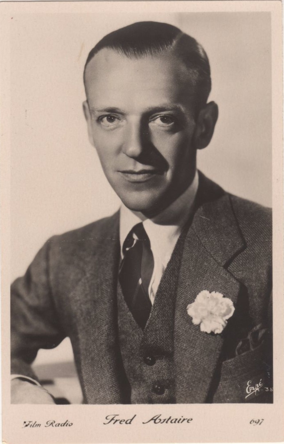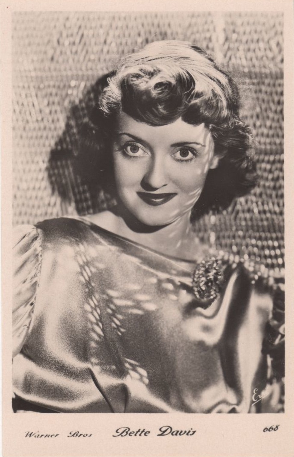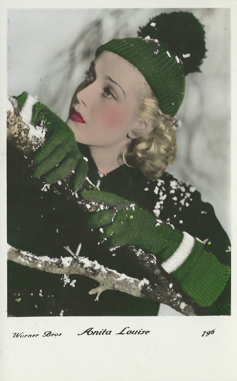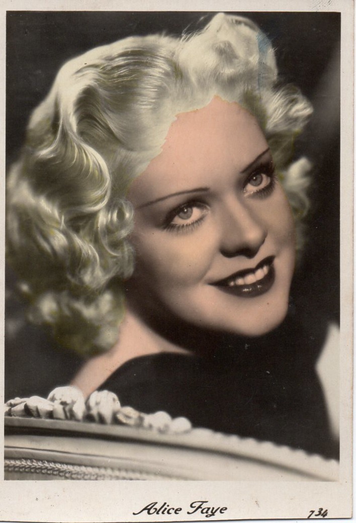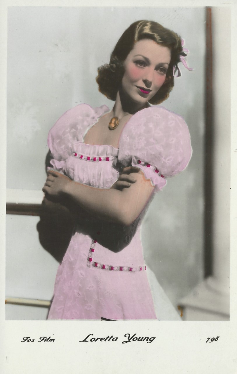 | Several 1938 and 1939 issues of Cinémonde magazine include a listing for three series of Erpé film star postcards. Series B cards are 9x14 cm and were produced in black-white glossy. Series B.C. cards are the same size but were tinted. Series I cards are chamois and larger in format at 15x10,5 cm. Series B and B.C. cards are numbered 501-888. In most cases cards for a given number depict the same image for both series. Therefore, the B and B.C. series cards are presented, intermingled, in a single catalog section below. Series I cards are numbered 1-225. The cards depict primarily French and American film stars. They are dated circa 1939, with Errol Flynn and Olivia de Havilland dressed in costumes from the 1938 film, 'Robin Hood' (cards 764 and 774), and Norma Shearer and Tyrone Power dressed in 'Marie Antoinette' costumes (cards 654 and 799), another 1938 production. Colors applied to the B.C. Series did not necessarily represent reality. Cards numbered 574 (below) demonstrate this variation in tints, with the dress and face and skin-tone changing color from card to card. |