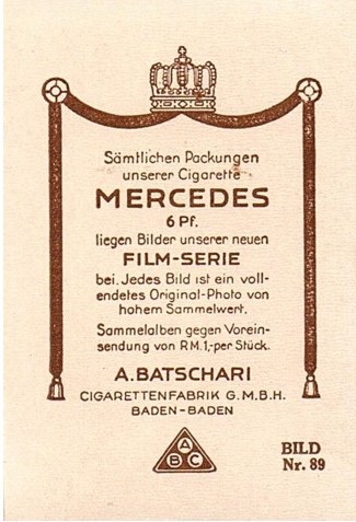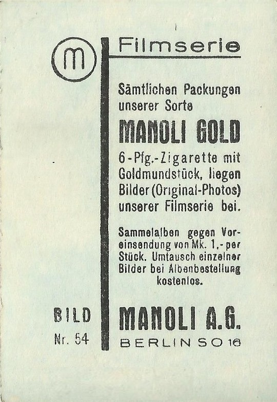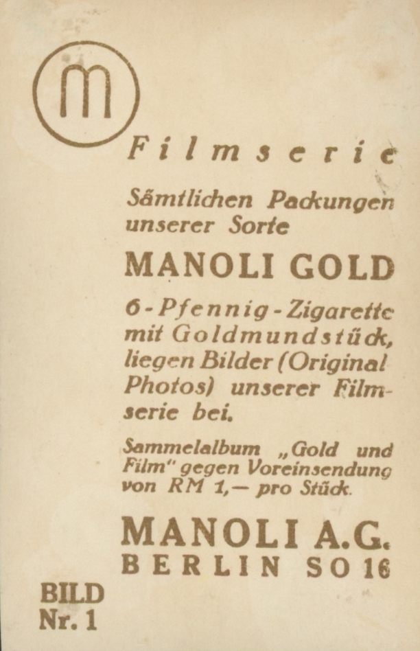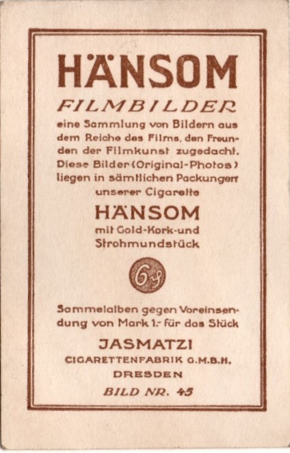 | Released during the 1930's and numbered 1-168, Ross' Filmbilder is a series of black-and-white photo cards measuring 1-3/4" by 2-5/8." The cards have printed backs. The Hänsom Jasmatzi version was known as Filmbilder;" other manufacturers labeled them Filmserie. The cards below have been extracted from the Virtual History website to be presented here in large format with other Ross images. Thank you! Check the site out! In providing these on-line digital catalogs as a resource to collectors worldwide, there is no intention to infringe on any copyright. If there are any objections to any of the images that are posted, please let us know so we can correct the problem. | ![]() |