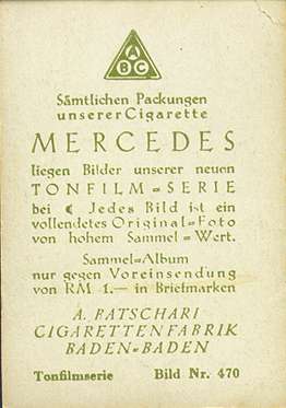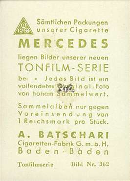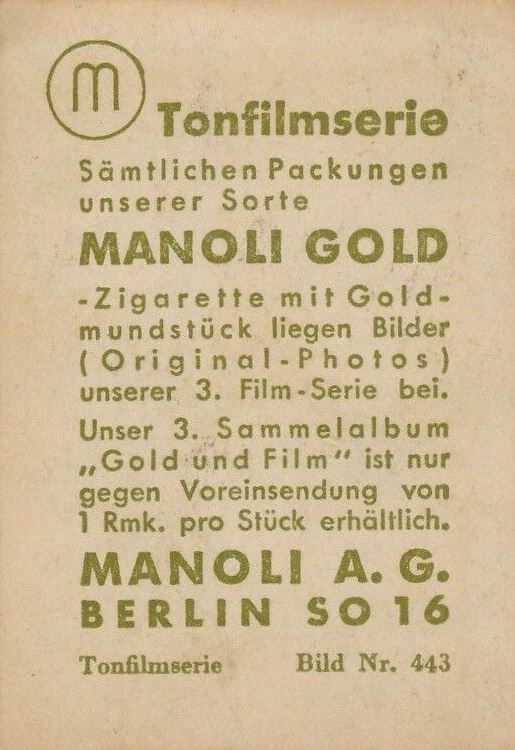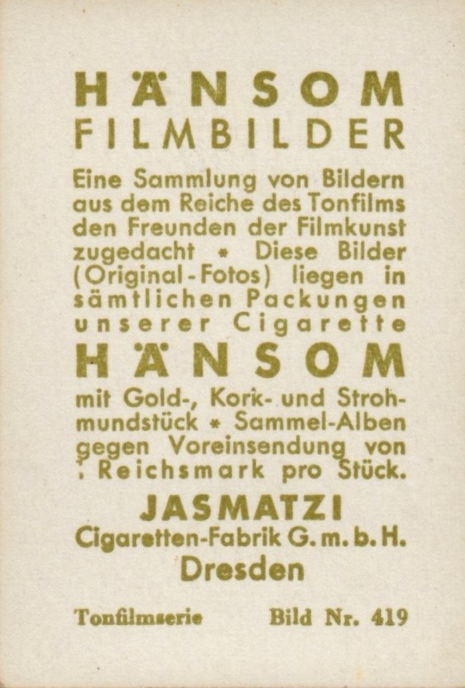 | Released during the 1930's and numbered 337-504, Ross' Tonfilmserie is a continuation of the series of black-and-white photo cards. Measuring 1-9/16" x 2-3/8", the cards have printed backs and were issued by Hänsom Jasmatzi, Batschari Mercedes, and Manoli Gold. The cards below have been extracted from the Virtual History website to be presented here in large format with other Ross images. Thank you! Check the site out! In providing these on-line digital catalogs as a resource to collectors worldwide, there is no intention to infringe on any copyright. If there are any objections to any of the images that are posted, please let us know so we can correct the problem. |