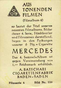 | Released during the 1930's and numbered 505-672, Ross' Aus tönenden Filmen is a continuation of the series of black-and-white photo cards. Measuring 1-9/16" x 2-3/8", the cards have printed backs and were issued by Hänsom Jasmatzi, Batschari Mercedes, and Manoli Gold. The cards below have been extracted from the Virtual History website to be presented here in large format with other Ross images. Thank you! Check the site out! In providing these on-line digital catalogs as a resource to collectors worldwide, there is no intention to infringe on any copyright. If there are any objections to any of the images that are posted, please let us know so we can correct the problem. |