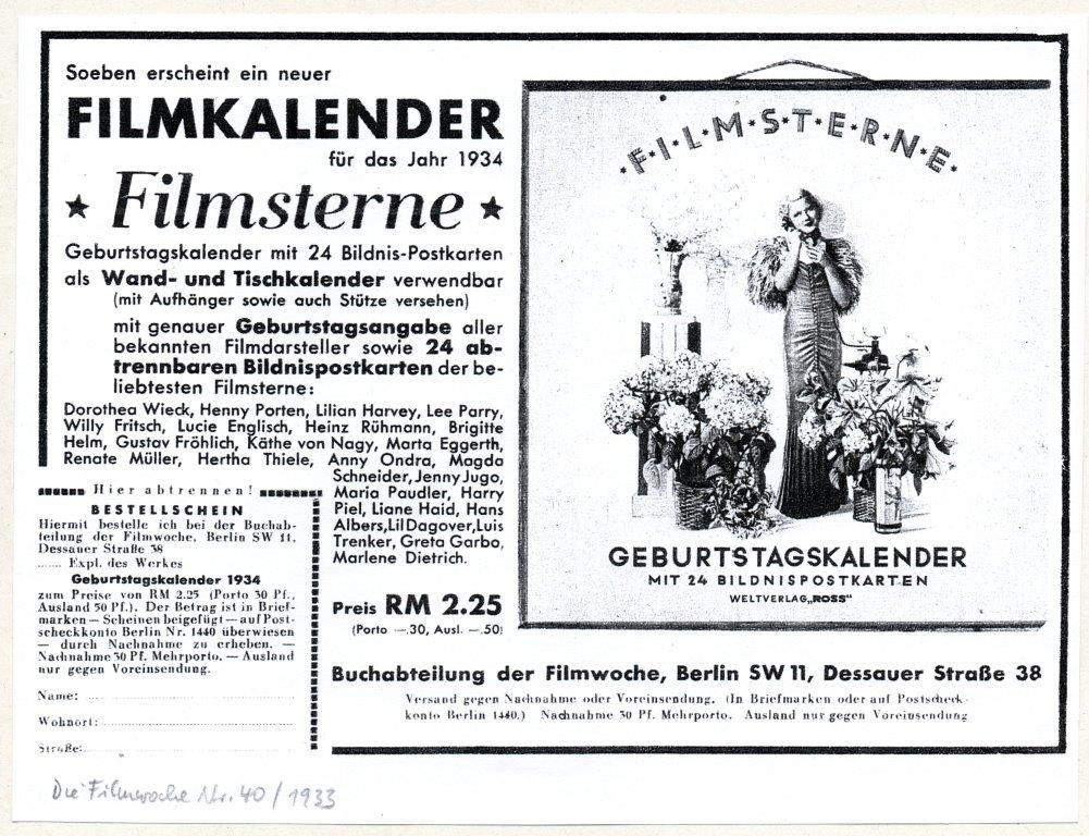 A wall and desk birthday calendar for well-known film stars was issued by Ross Verlag for the year 1934. The calendar included 24 removable portrait postcards which are presented below. Advertised in Die Filmwoche (No. 40, 1933), the calendar's price was RM 2.25.