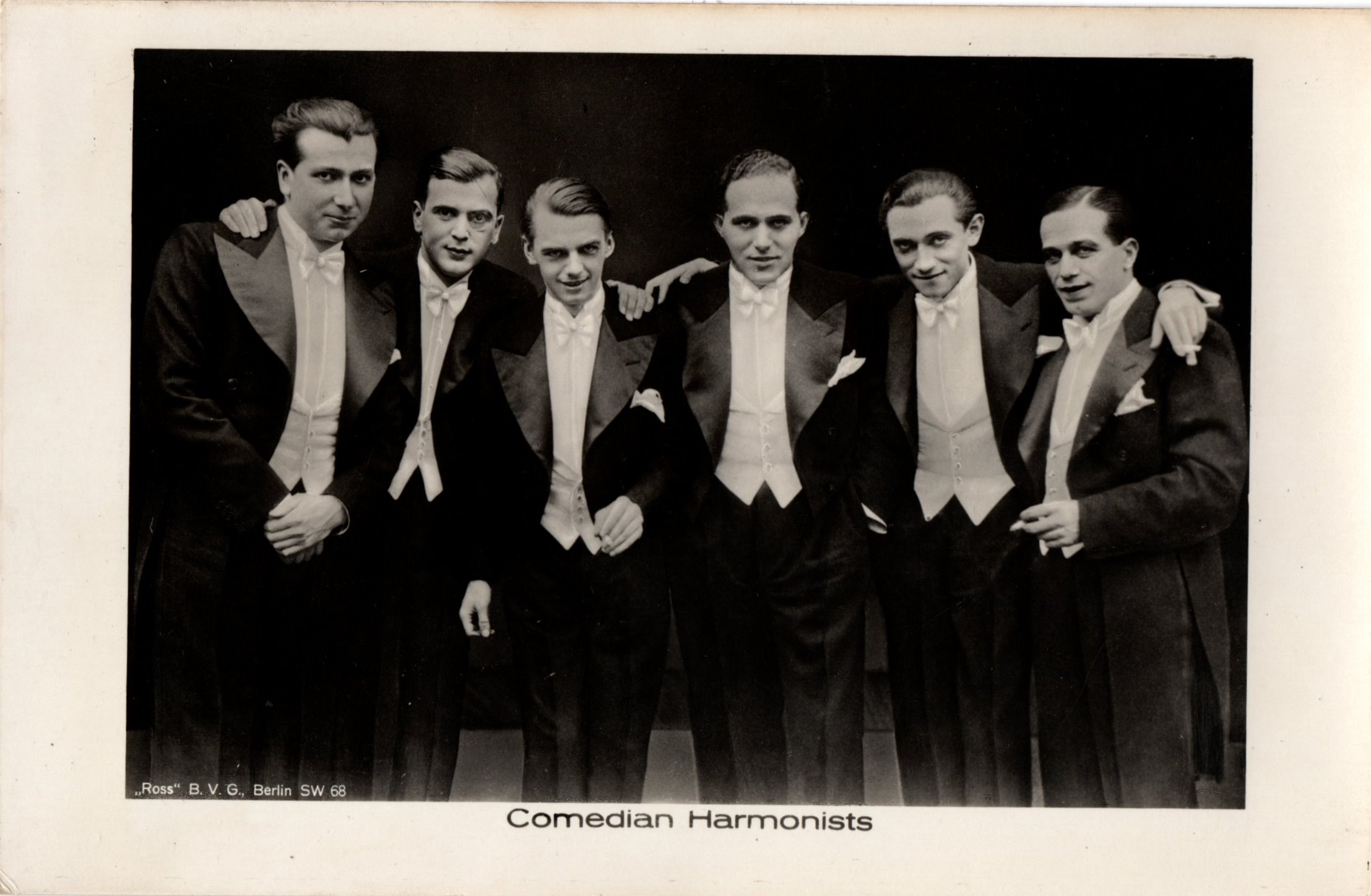 ![]() Unnumbered Comedian Harmonists Left to right: Robert Biberti (1902 - 1985); Erich A. Collin (1899 - 1961); Erwin Bootz (1907 - 1982); Roman Cycowski (1901 - 1998); Harry Frommermann (1906 - 1975); Asparuch (Ari) Leschnikoff (1897 - 1978) |